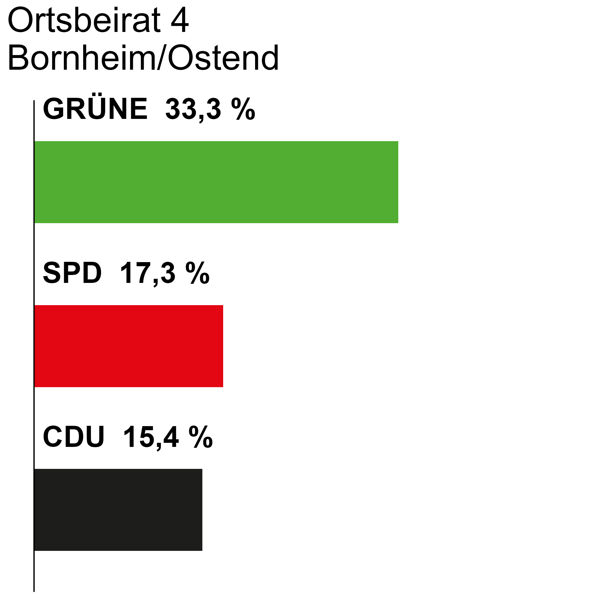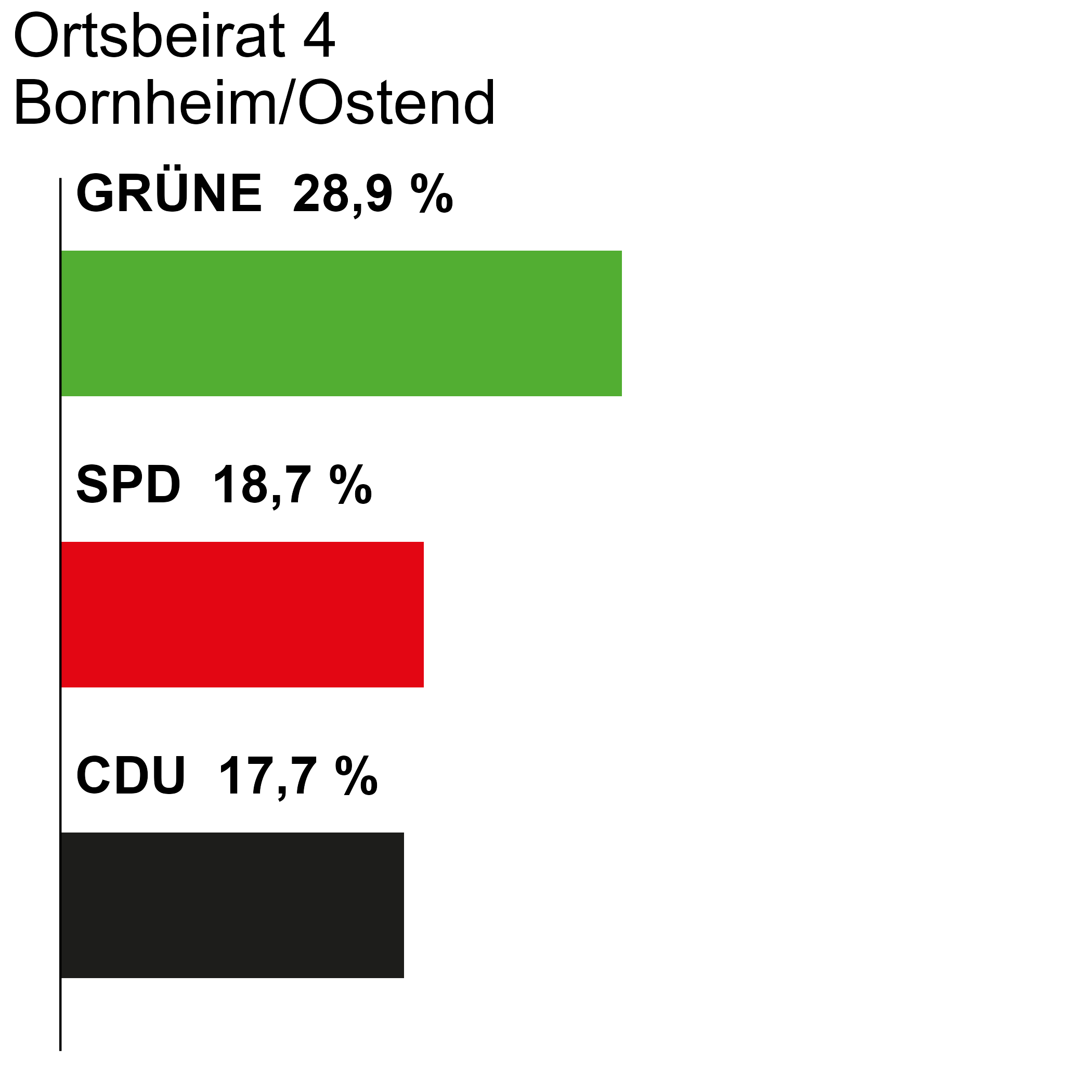 Im Vergleich zur Wahl 2021, bei der sie besonders stark hinzugewonnen hatten, verzeichneten die Grünen die deutlichsten Stimmenverluste. In allen Ortsbezirken gingen ihre Stimmenanteile zurück. In der Folge erreichten sie mit 66 Mandaten zwölf weniger als 2021. Besonders deutlich waren die Rückgänge im Frankfurter Norden, in den Ortsbezirken 14 (-9,2 %-Punkte) und 15 (-7,1 %-Punkte). In zwölf der 16 Ortsbeiräte verloren die Grünen je einen Sitz.