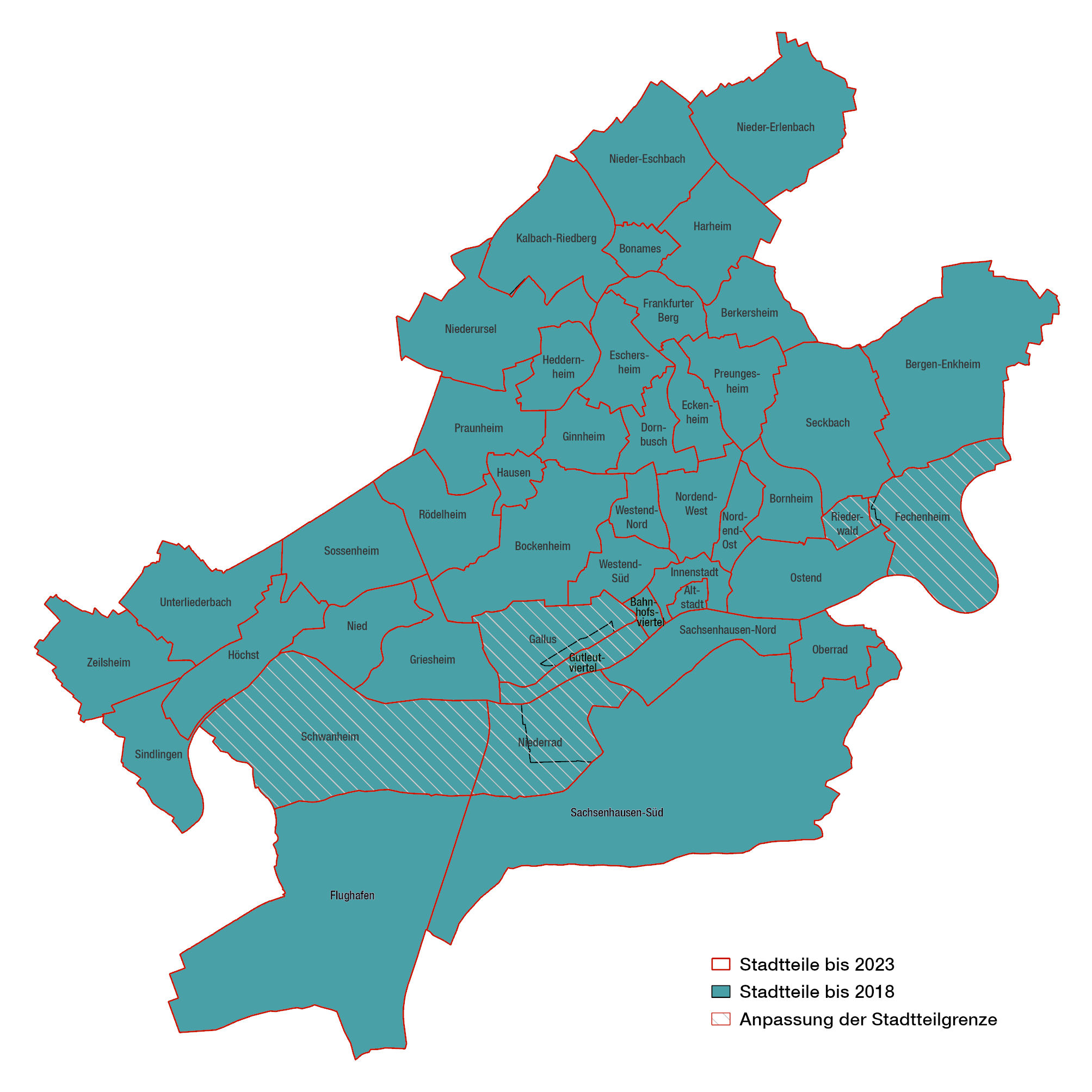 Der Großteil der Flächenveränderung auf Stadtteilebene ist auf die 2018 durchgeführten Anpassungen der Stadtteilgrenzen zurückzuführen. Die bedeutendste Änderung betrifft die Neuzuordnung des Lyoner Viertels (ehemals Bürostadt Niederrad) zum Stadtteil Niederrad. Der ehemalige Schwanheimer Bezirk wurde neu strukturiert, um sowohl bestehende als auch geplante bauliche Entwicklungen zu berücksichtigen. Die Änderungen der Flächennutzung in den Stadtteilen Riederwald und Fechenheim sind ebenfalls auf die Anpassung der Stadtteilgrenze zurückzuführen. Die Neuordnung der Stadtteilgrenze im Gallus- und Gutleutviertel resultiert aus der dynamischen städtebaulichen Entwicklung im Neubaugebiet Europaviertel und aus der Verschiebung des Gleisvorfeldes, das vollständig dem Gallusviertel zugeordnet war.